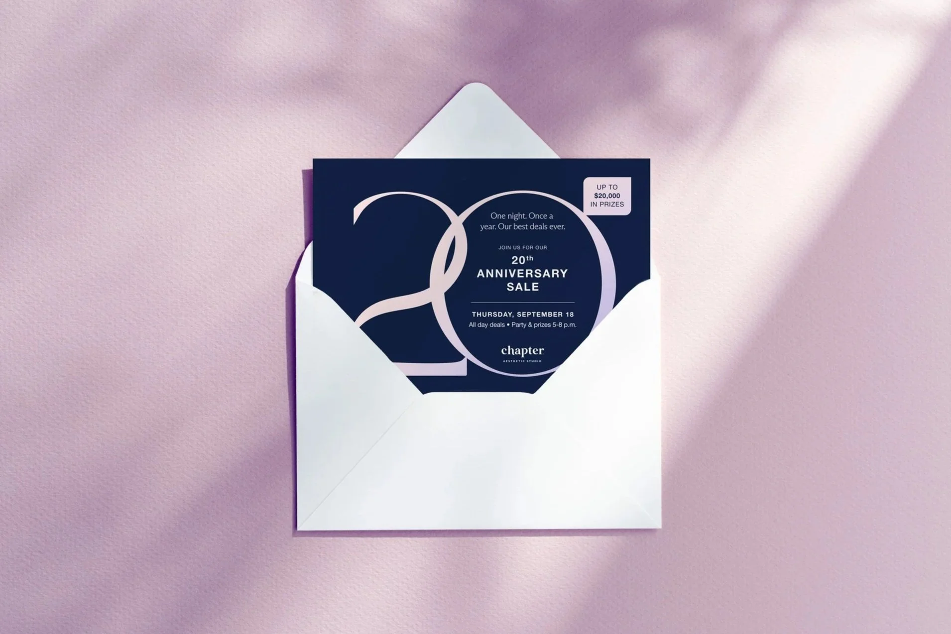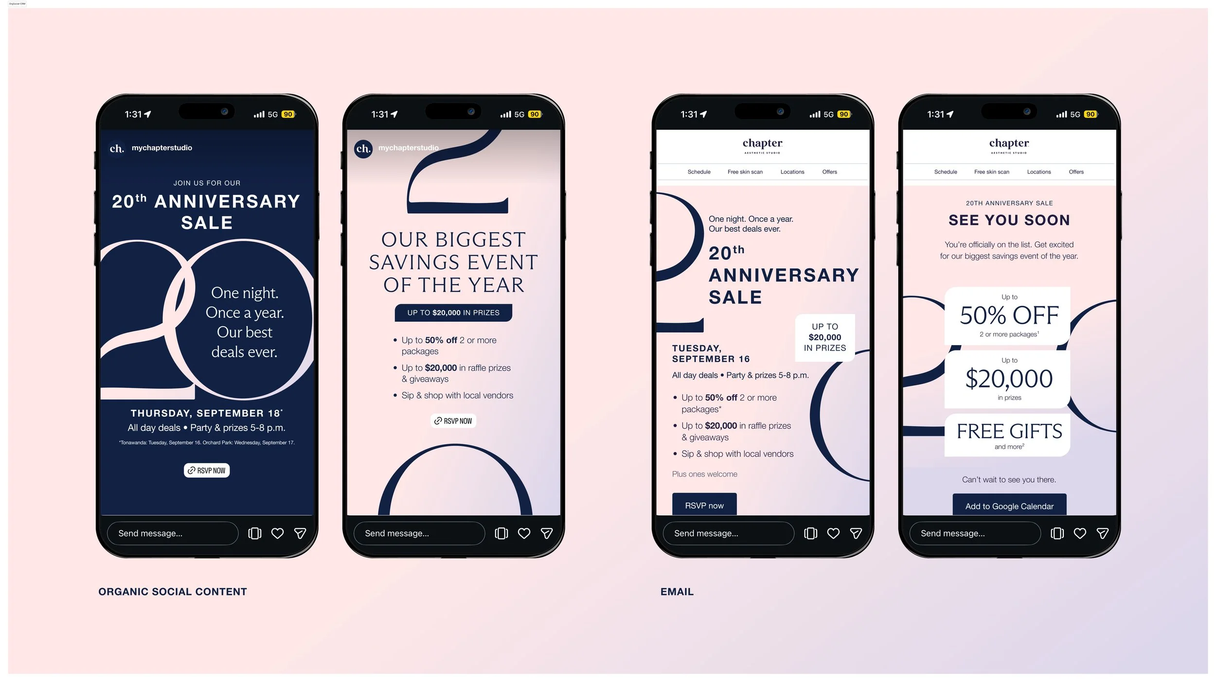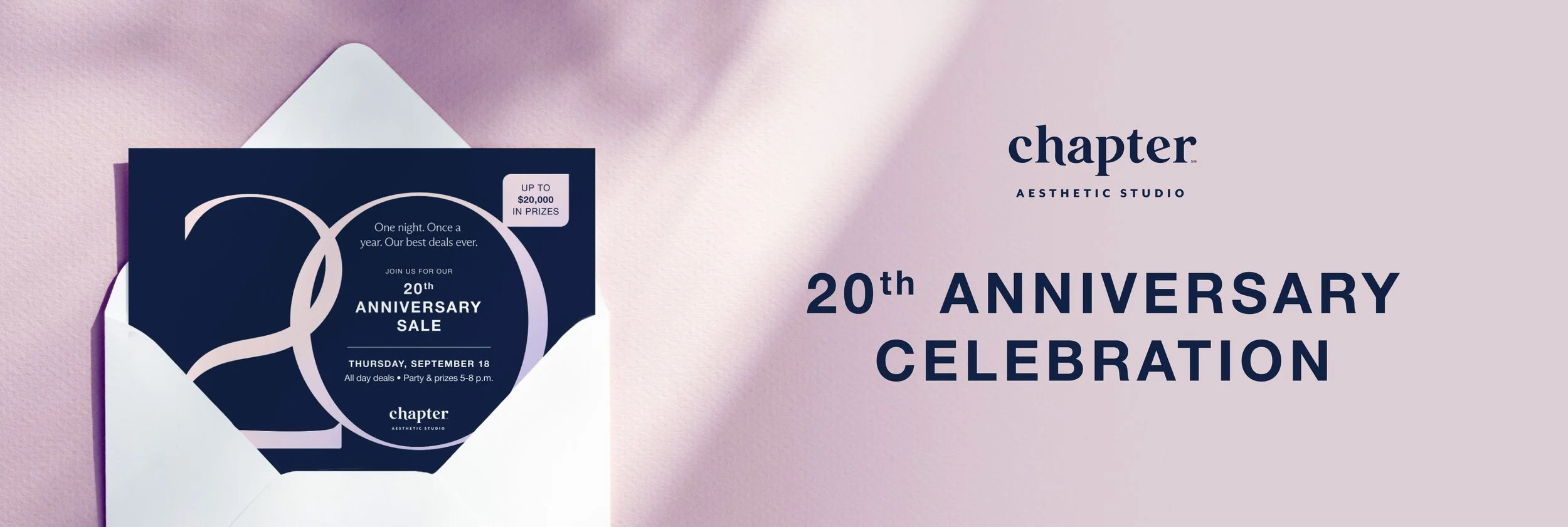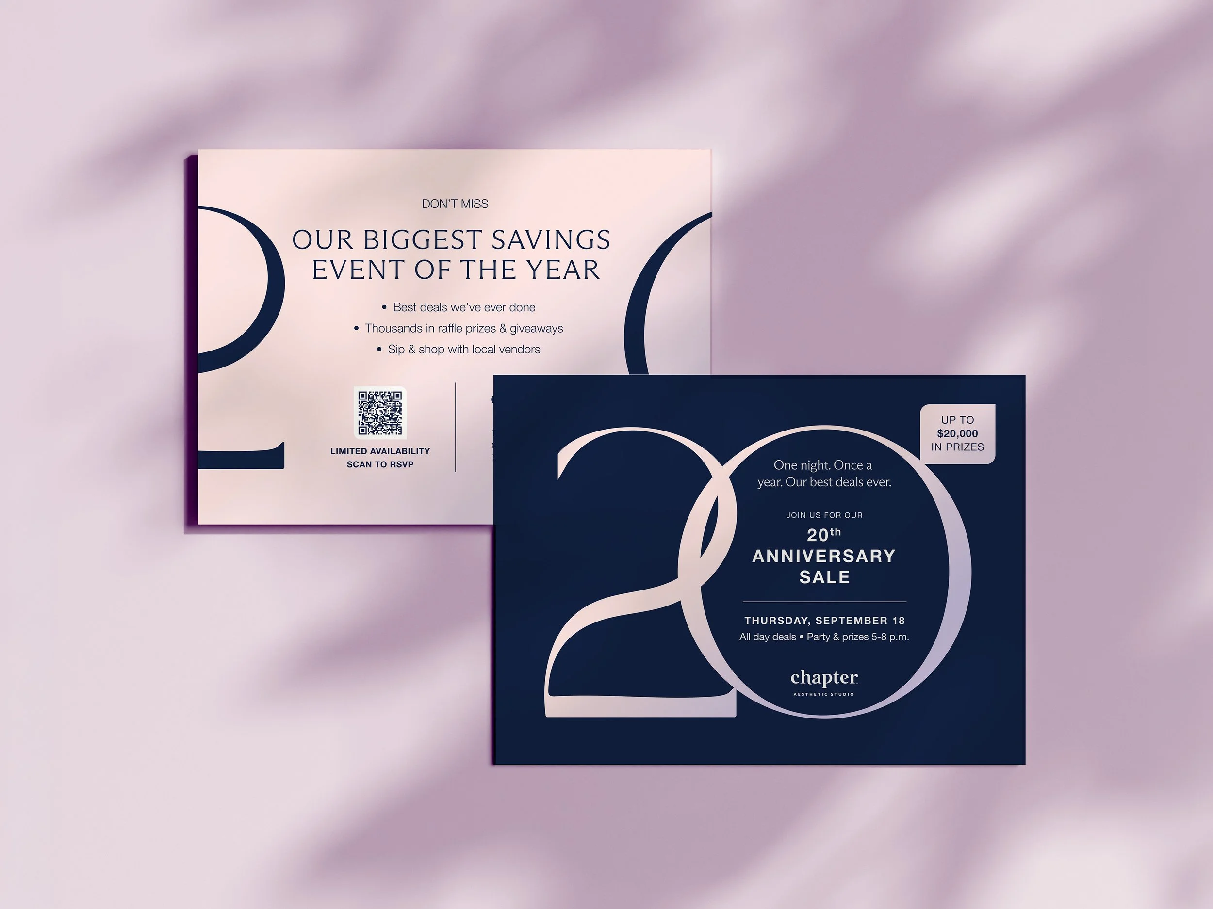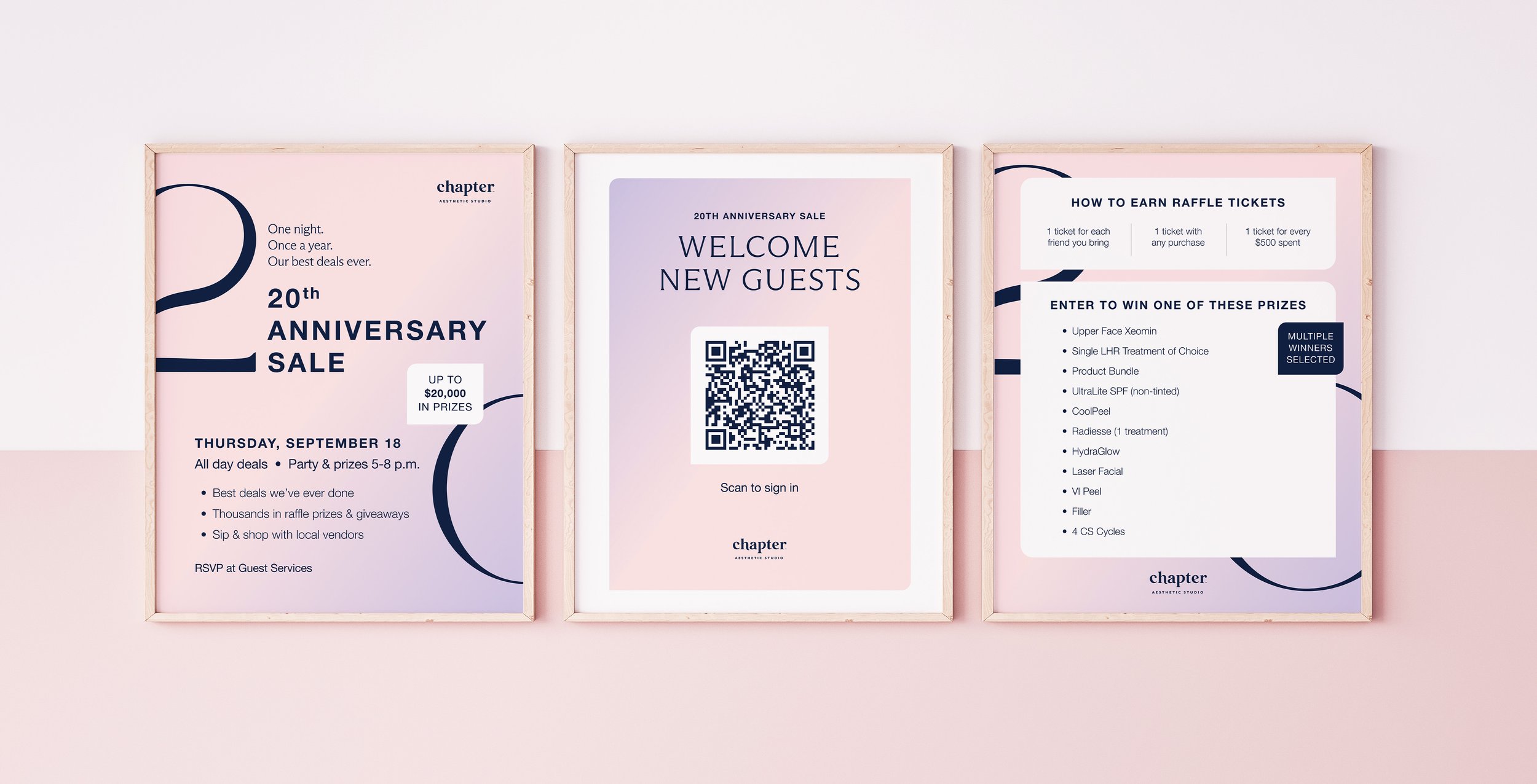 2025 marked 20 years of Chapter Aesthetic Studio. To celebrate this milestone, each of the 22 studios put on a 20th Anniversary Party that included deals on treatments, raffle prizes and giveaways, local vendors, and treats for customers. As Art Director/Digital Designer, my role was to design creative assets for the event.